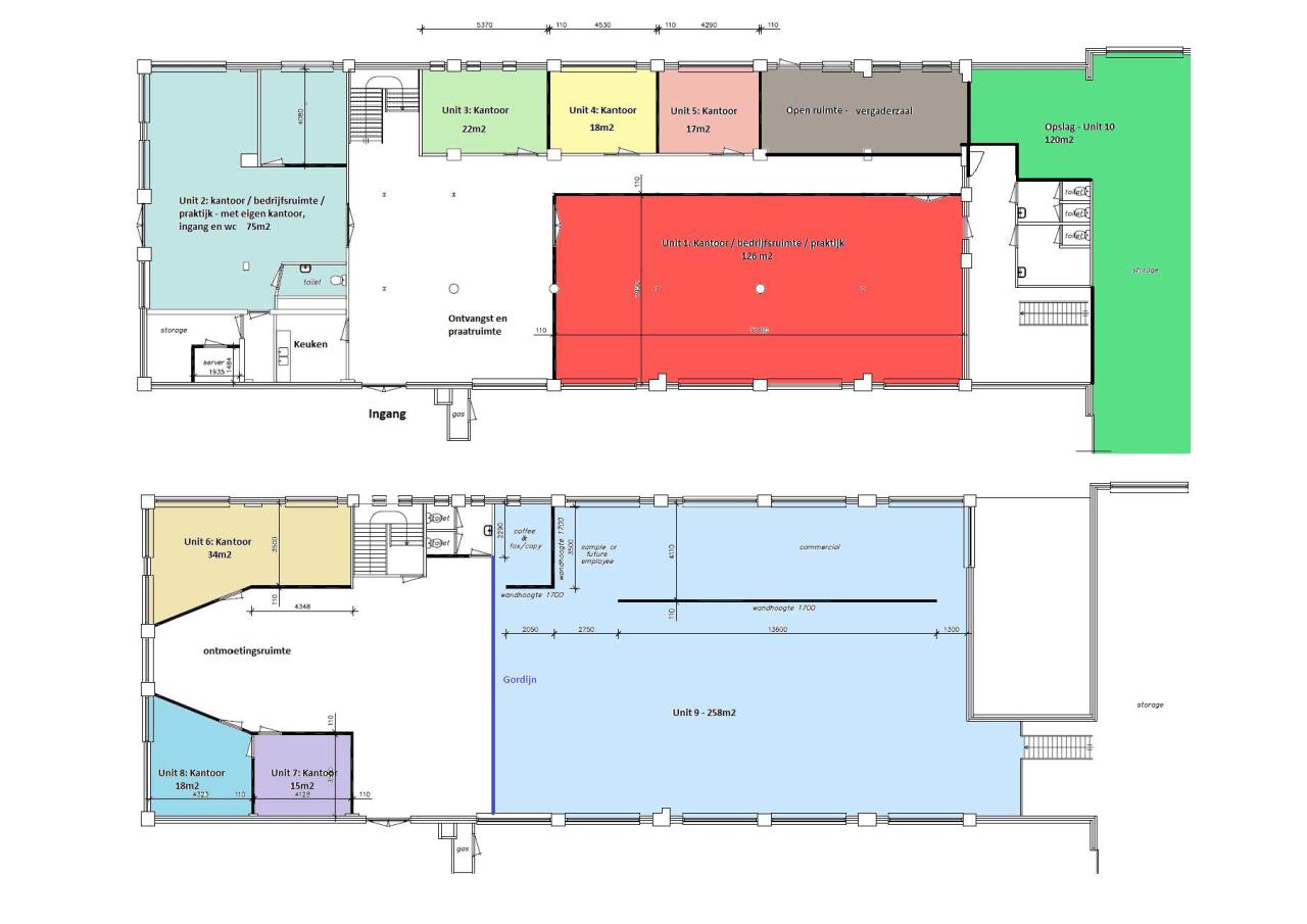 Het object biedt diverse ruimten met verschillende oppervlakten. Kleinschalig (vanaf 17m²) tot grootschalig (450m²), maar ook een magazijn van 120 m² voorzien van overheaddeur.